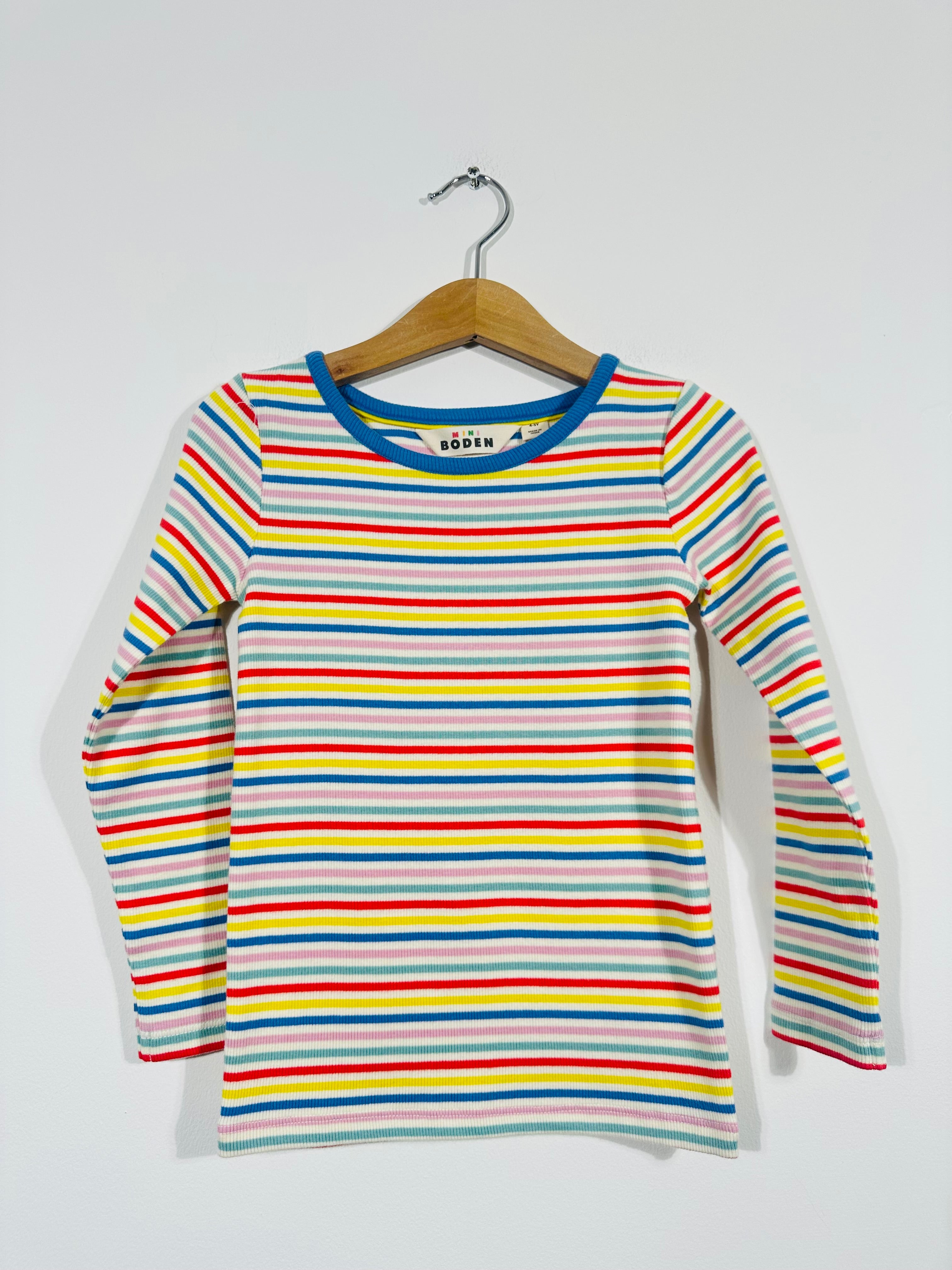 A cheerful Mini Boden ribbed long sleeve top in the prettiest rainbow stripe. Soft, stretchy cotton with a bright blue neckline trim — perfect for layering or wearing on its own. One of those happy everyday staples that goes with everything.Â