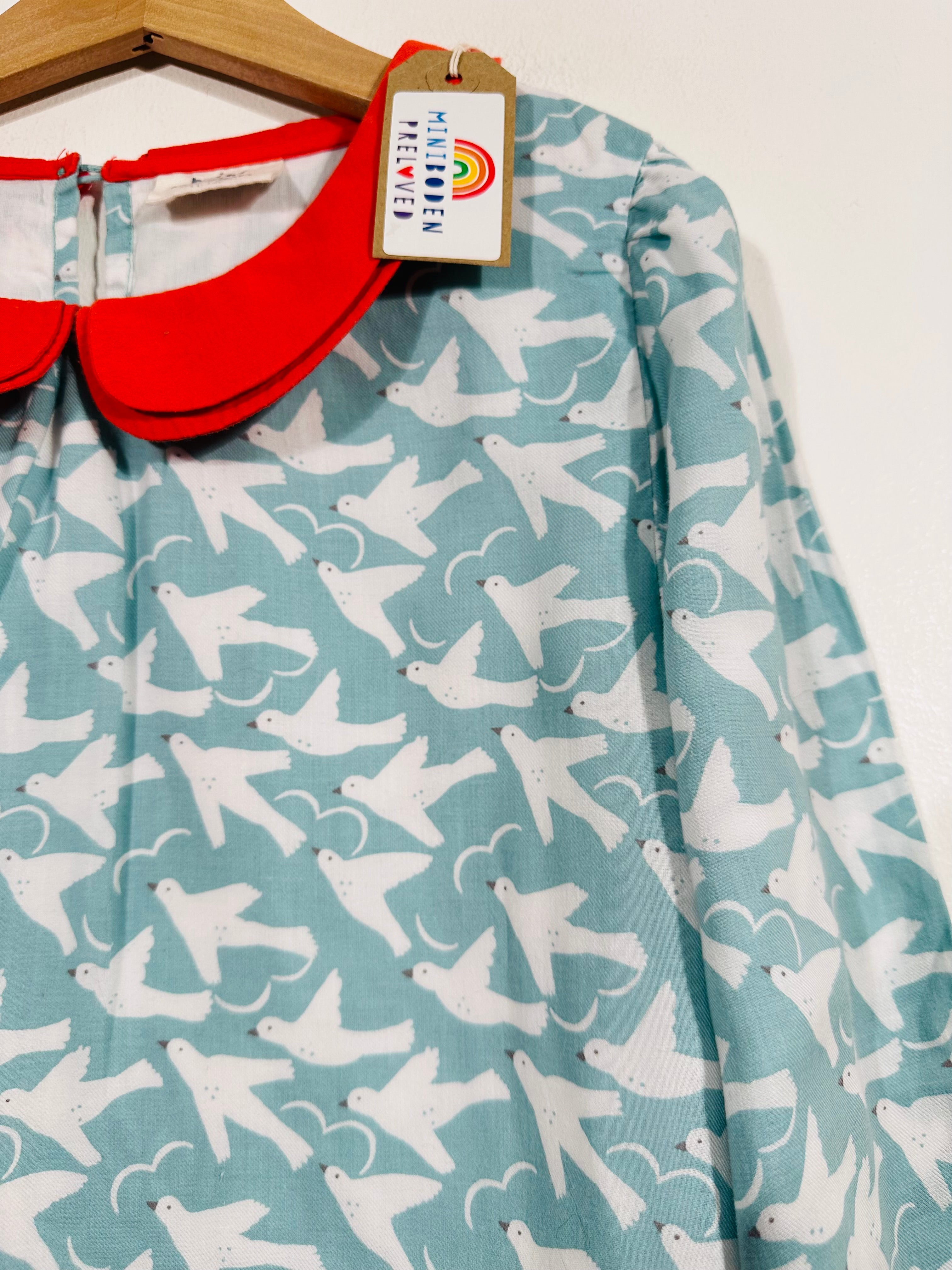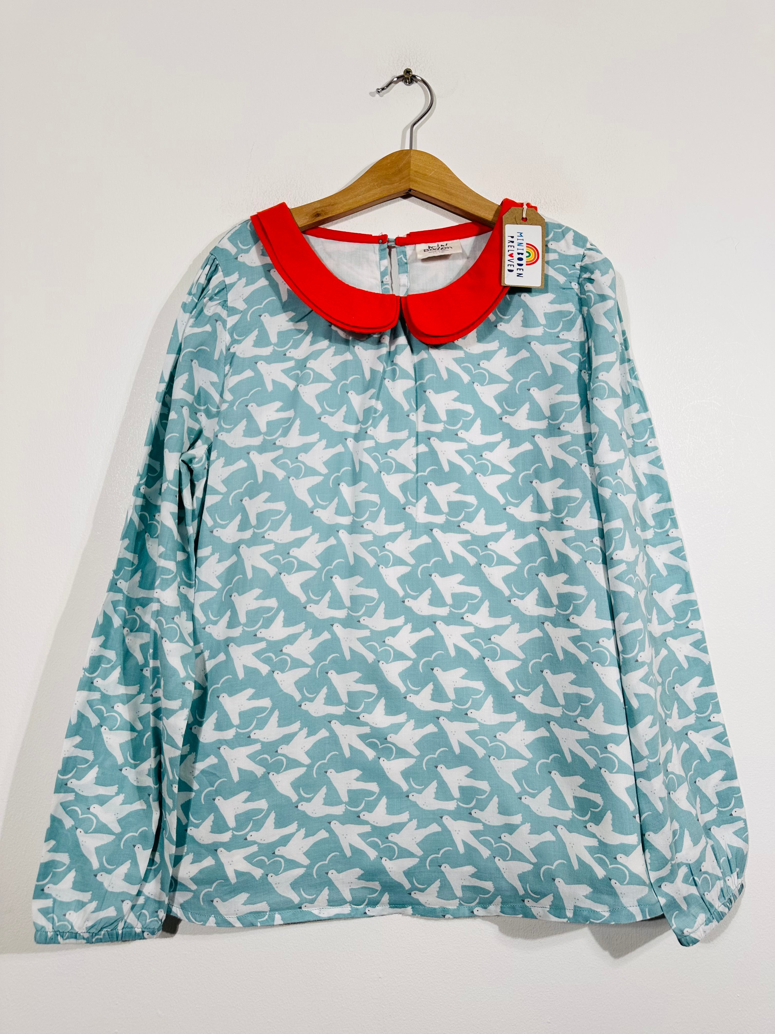 A beautiful pale blue blouse with a white swallow print design and red Peter Pan collar. The blouse is in very good condition and would look perfect matched with cords or dungarees.