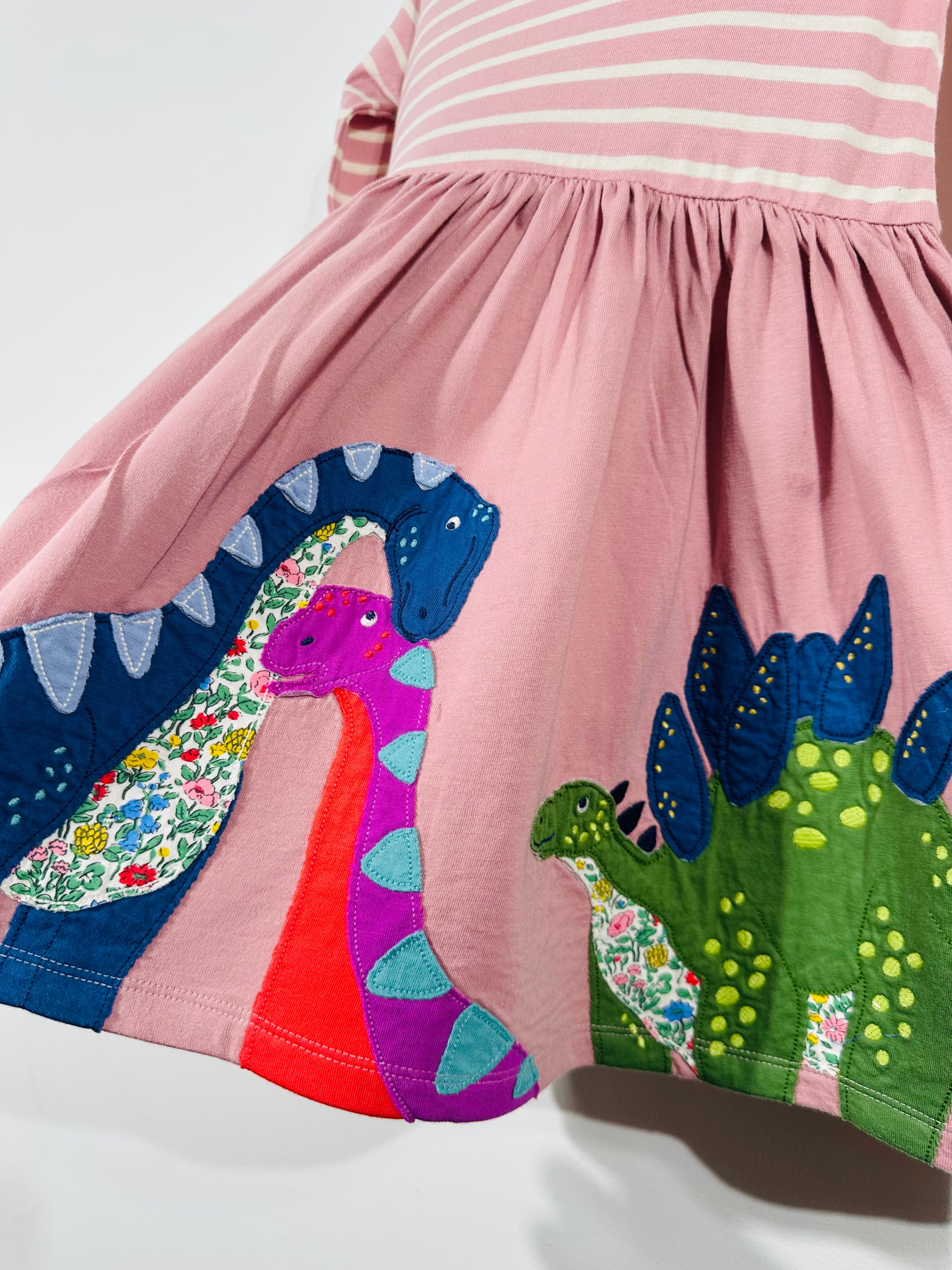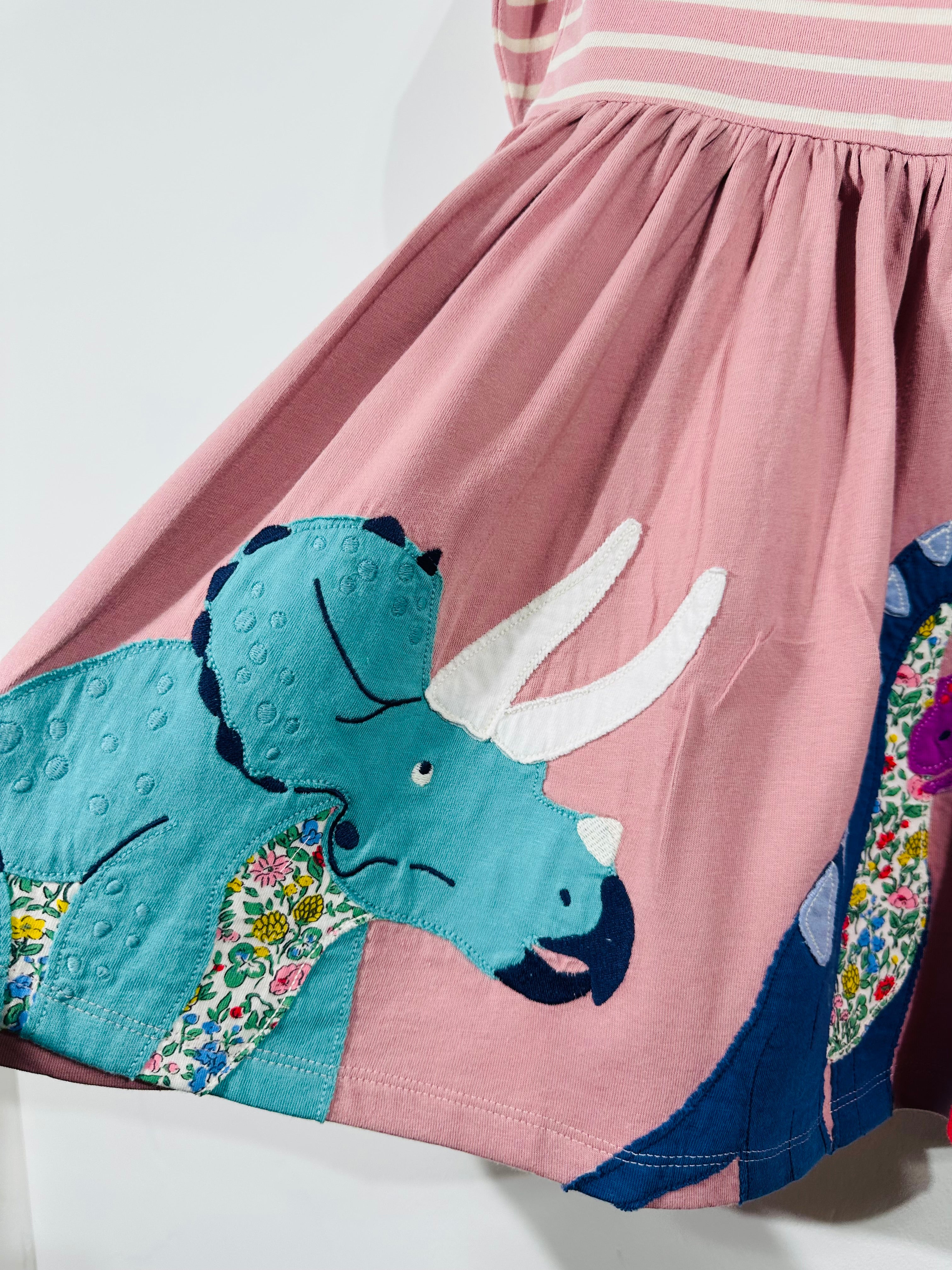 This playful pink stripe dress is packed with character – featuring a full circle skirt decorated with colourful appliqué dinosaurs, each with floral-print details 🌸 A true showstopper for dino fans!