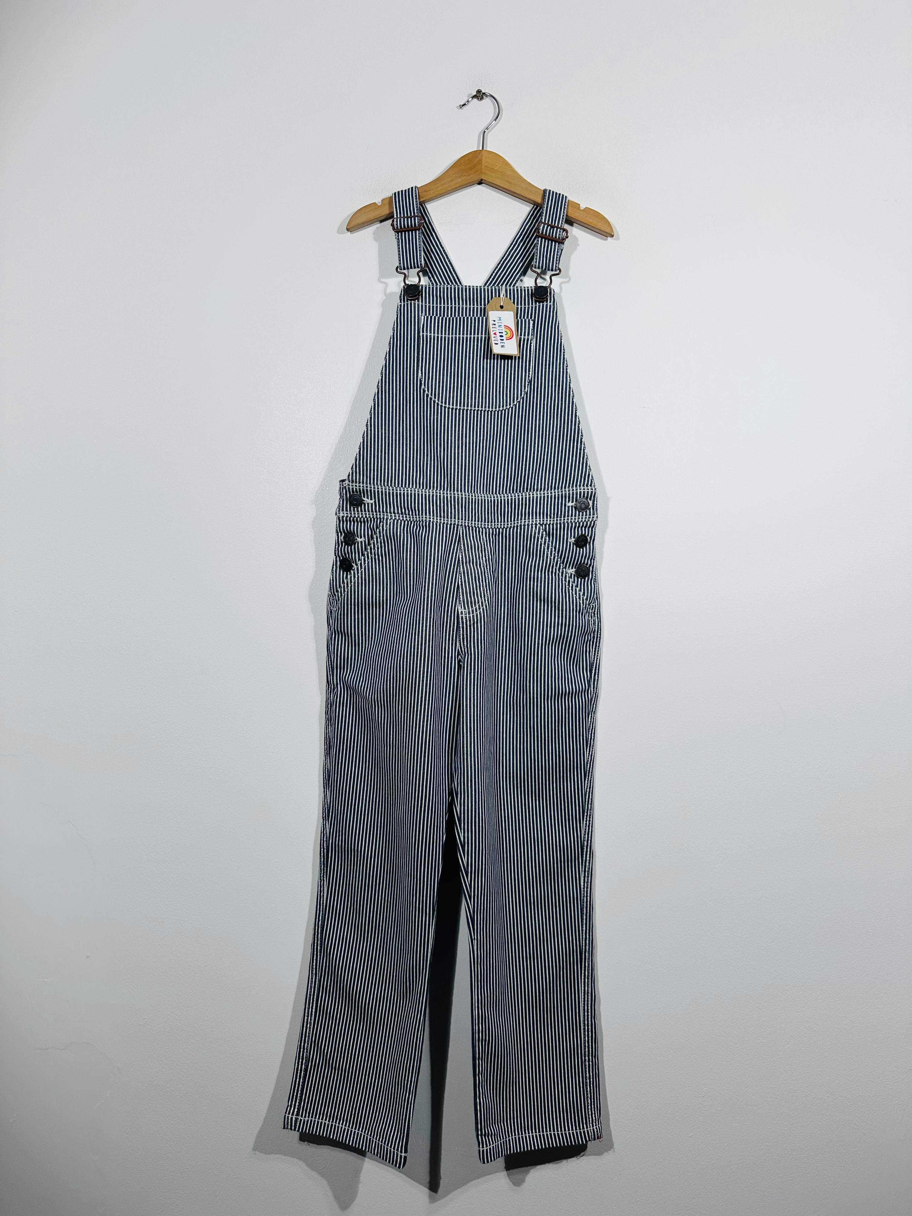 A pair of fabulous black pinstripe dungarees in excellent condition. The dungarees have adjustable straps and side poppers and can be paired perfectly with a variety of jumpers and tops.